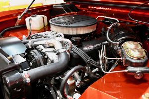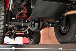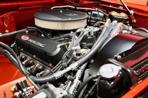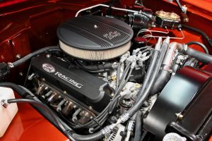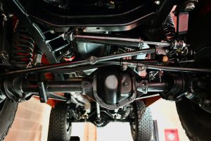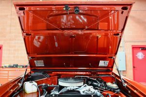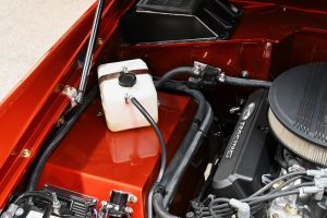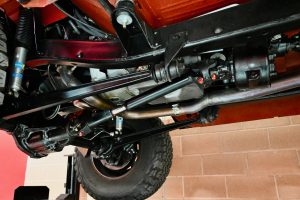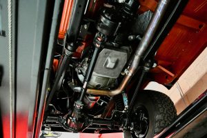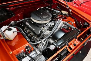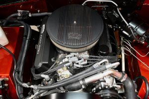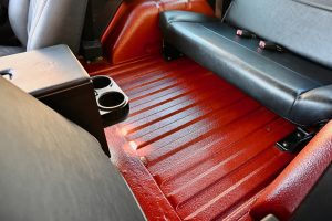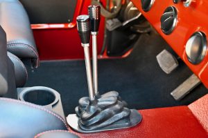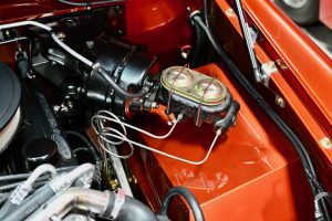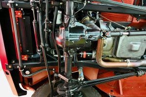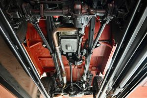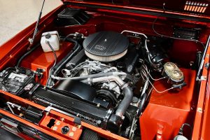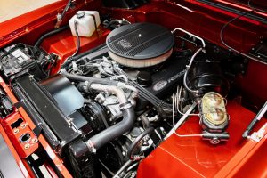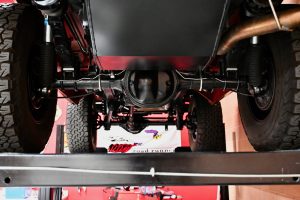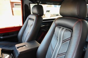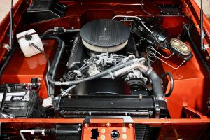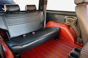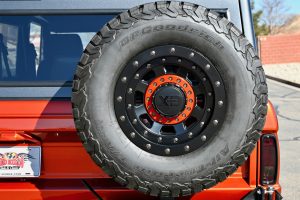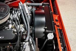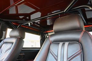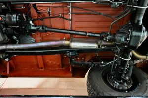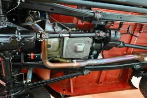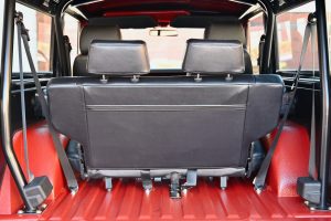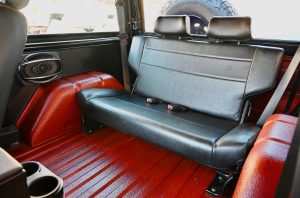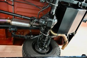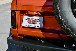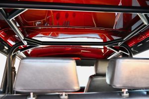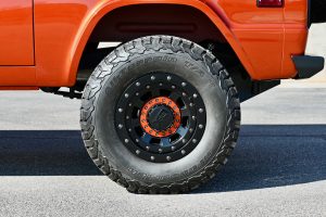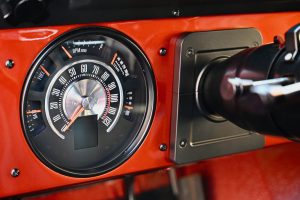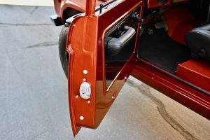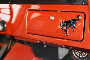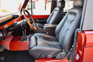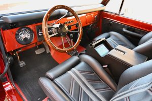 Open the driver’s door and you will find a gorgeous custom interior that was cleverly designed w/ all of the creature comforts that you could ever want. Interior features include: painted dashboard, two-tone painted door panels, custom black leather bucket seats w/ orange stitching, custom fiberglass interior trim, custom fiberglass headliner, Ididit tilt-steering column, 14” hand-rubbed mahogany steering wheel w/ decorative aluminum rivets, finger grips on the back of the rim, black aluminum horn button, and anodized brushed aluminum spokes, Nu-Relics power windows, power door locks, Vintage Air Gen IV air conditioning, ICON center console w/ Pioneer Touch Screen Bluetooth sound system w/ remote, custom fiberglass speaker pods w/ Pioneer speakers, Digital Guard Dawg push-button ignition, Digital Guard Dawg vehicle tracking, fold & tumble rear seat, Krawlers Edge roll cage, and more! The floors feature custom color-matched Raptor lining, which looks excellent and is super durable. This custom interior is absolutely beautiful, extremely comfortable, and fully functional in every way.