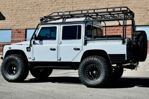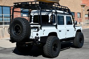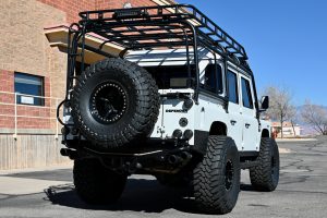 This particular build was commissioned for a high-end client here in Utah, and started w/ a 1992 Land Rover Defender 110 4-Door Crew Cab donor, that was in excellent condition to start with, and 100% rust-free. It then underwent a no-expense spared body-off restoration, full nut & bolt, using all brand-new high-quality parts & components. The body was finished in Alpine White, using high-quality Spies Hecker paint and implementing a new multi-layer system, including aluminum primer, as well as base-coat & clear-coat. Exterior features & upgrades include: Bigfoot nose upgrade, tubular Bigfoot front bumper, Fire & Ice side steps, NAS rear step bumper, diamond-plate exterior package, swing-away wheel carrier, skid-plate/steering guard, Safety Devices external roll-cage, Safety Devices full-length roof rack w/ ladder, metal PUMA hood w/ stainless steel fixings, WARN ZEON 10-S remote-controlled winch, 4X LED high beam lights on cage up front, 1x LED reverse light bar on cage in back, LED headlights, LED taillights, sliding windows between cabin & trunk bed, and much more. The original frame was industrially cleaned (internally & externally), shot blasted, epoxy coated, and then completely painted. A durability package was added, including a hot-dipped galvanized bulkhead, new rear cross-member, middle cross member, and all new metal brackets. All of the suspension was upgraded w/ high performance shocks, as well as heavy-duty anti-roll bars front & rear. This awesome truck rolls on black 16” Bigfoot beadlock wheels, wrapped w/ Toyo M/T Open Country tires (LT385/70/R16). She has a perfect stance and looks quite mean & ominous. You can walk around this truck a hundred times and she looks absolutely perfect from every angle.